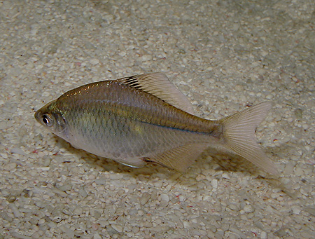 ショップにヒガイが入荷しました。この魚は背びれの黒帯とオレンジのコンビがとっても印象的です。ところで行き付けのショップにはいつも夕方に行くのですが川魚の水槽が屋外に置いてある関係(あまり大切にされていないようで…。)で西日が差し込んでなんともいえない雰囲気です。夕焼けの時などは特に綺麗で日本産淡水魚には抜群のシチュエーションです。 この情景の中でのヒガイは正に絶品で又しても衝動買いをしてしまいました。早速家に帰って記念撮影ですが夕日の中の雄姿は撮れませんものね。それでもヒガイ(写真)は美しくて、水槽美人に見えますでしょうか。