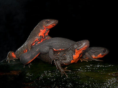アカハライモリのゲージを覗き込むと、いつも和やかな雰囲気が漂って居ります。流木の上ではご覧の仲のよい三匹が何かを見付けられたのか神妙な眼差し。スローモーな彼らを見ていると、いつの間にか睡魔に…。休日の早朝、別室の彼は、これはまた随分とくつろいで居られるようで。